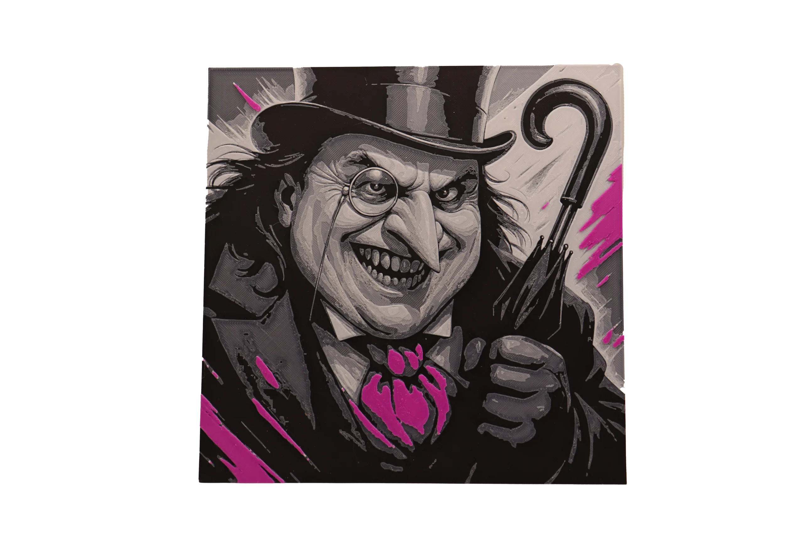 Imprimée en 3D multicouche selon la technique officielle Hueforge, cette œuvre révèle à la lumière le regard calculateur et le style inimitable de ce criminel élégant, reconnaissable à son chapeau haut de forme et son parapluie emblématique 🎩☂️.