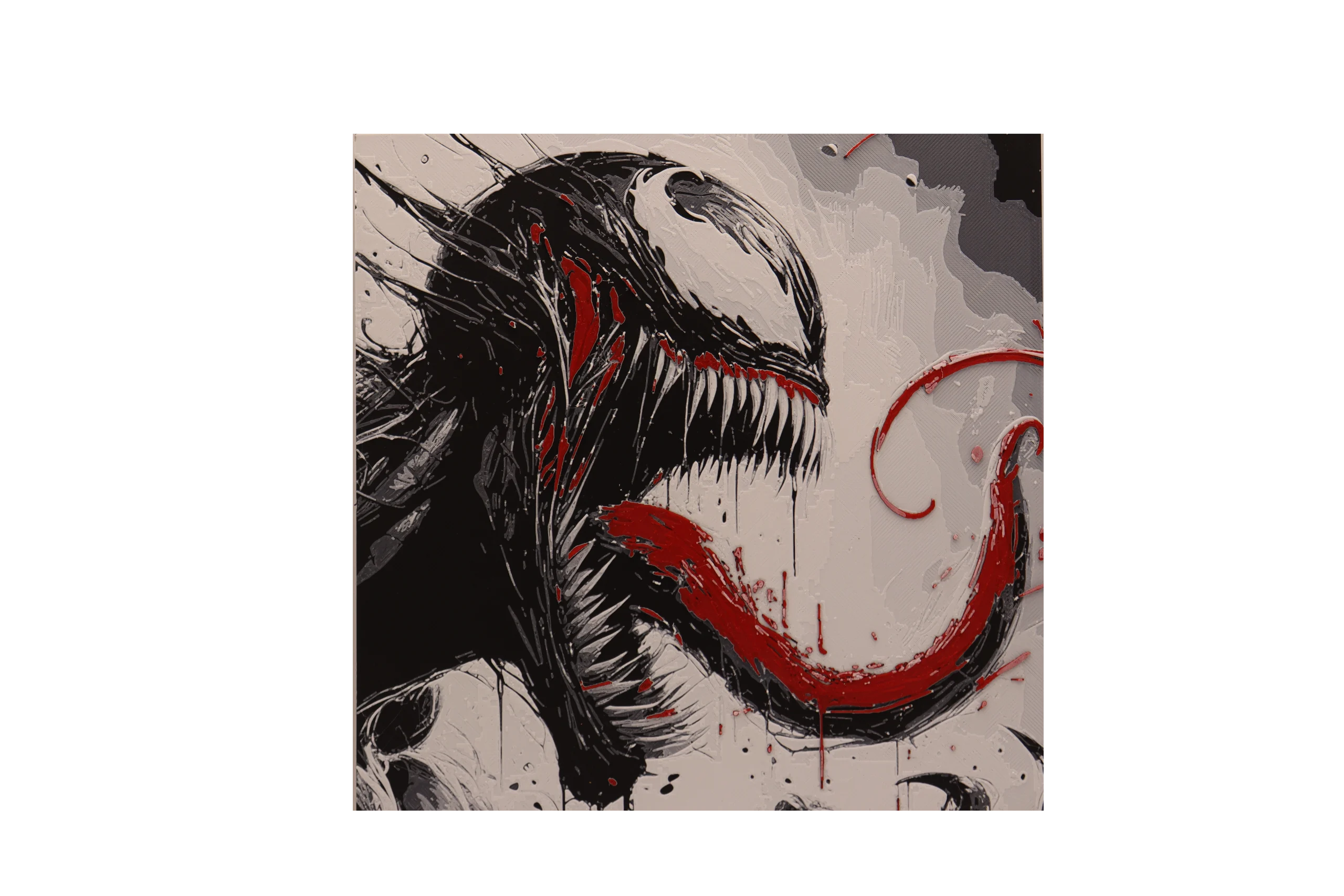 Hueforge 3D de Venom (Marvel). Format 200×200 mm, effet lumineux, avec ou sans cadre. Fabrication artisanale française par Les Projets de Shaya.